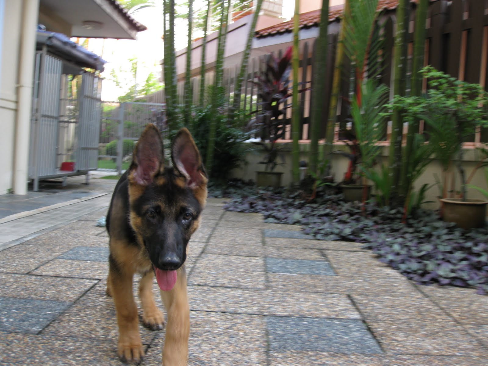 Sunday too is different. It is earmarked for a visit to the German Shepherd Dog Club! Well before Kulfi's arrival, we had started visiting the club and meeting with people there. It is located in a quiet part of the city and is a beautiful place with a large expanse of green where dogs can run around. There is even a pond for them to dive into and swim. Every Sunday evening dog owners converge there, some for the training lessons and others just to socialise their animals. During the course of our visits, we gained valuable tips from pet owners on do's and dont's of rearing puppies, besides learning about pet foods, veterinarians, and other essentials. Sometimes one receives pretty mind boggling advice from a concerned dog owner...like when I was told to feed the pup mineral water for its first few days in Singapore! I had dogs all through my growing years, but only after moving to Singapore have I learnt the myriad complexities associated with pet ownership. I wonder how we brought up our dogs without such nuanced understanding of pet behaviour and pet care?? But in general, one comes across pretty knowledgeable and caring folks. The club is great fun for dog lovers and one gets to see dogs of various breeds sauntering in and running around. Last week as I drove out from there, it suddenly struck me that I had come across some of the friendliest people in Singapore in this very place.